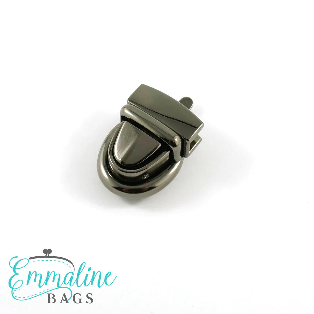 Install this little lock bysliding the press part onto a finished bag or wallet flap and screwing through the back to secure - USE GLUE for security! Place the backing plate prongs (the catch part) through your fabric and secure over a washer. Add a layer of stabilizer in between for strength. Easy!