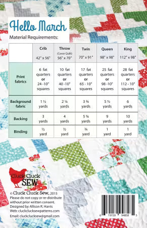 Embrace the spirit of spring with the "Hello March" quilt pattern, perfect for adding a vibrant touch to any bedroom. This quilt features a dynamic patchwork design with a mix of cheerful colors including teal, pink, red, and green, creating a lively and inviting atmosphere. Available in multiple sizes to suit different needs: Crib (42in x 56in), Throw (56in x 70in), Twin (70in x 91in), Queen (98in x 98in), and King (112in x 98in), this quilt pattern is ideal for both B2B and B2C markets. The pattern is layer cake and fat quarter friendly, making it accessible for quilters of all levels. Whether you're looking to refresh your home decor or offer a unique product in your store, this quilt pattern promises to bring a touch of springtime joy to any setting.