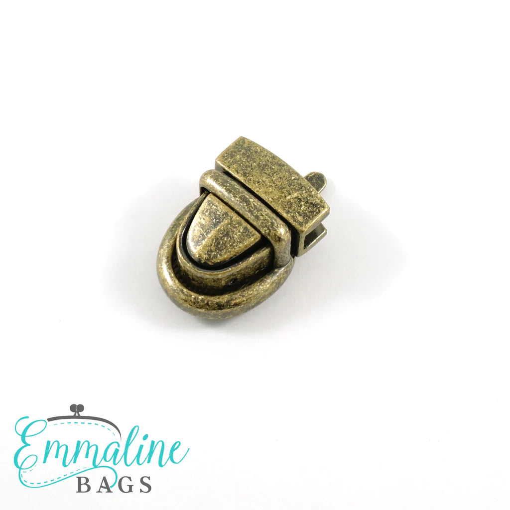Install this little lock bysliding the press part onto a finished bag or wallet flap and screwing through the back to secure - USE GLUE for security! Place the backing plate prongs (the catch part) through your fabric and secure over a washer. Add a layer of stabilizer in between for strength. Easy!